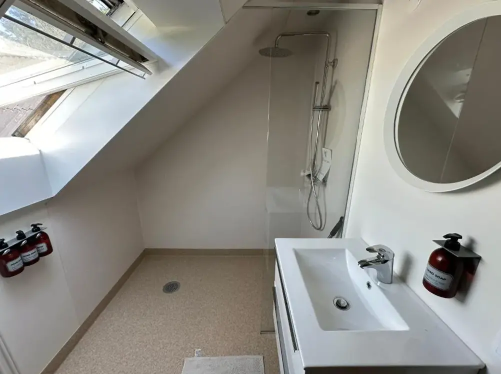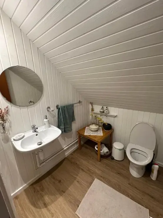 Almindeligt badeværelse og toilet. Et knirkende gulv i gangen, hvor alle trin fra andre gæster blev hørt.